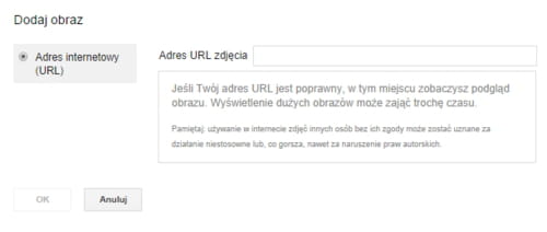 Wstaw obraz. W odpowiednie pole wklej link ze skopiowanym adresem zdjęcia. Zanim zapiszesz ustawienia nowego podpisu, możesz sprawdzić, jak wygląda fotografia oraz ją edytować (przyciąć, zmniejszyć rozmiar itp.):
