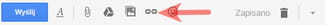 Zaznacz za pomocą kursora tekst, w którym chcesz umieścić link, a następnie kliknij w symbol spinacza, który znajduje się w dolnej części strony: