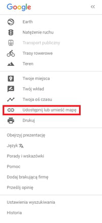 Otwórz Mapy Google i zlokalizuj miejsce lub obszar, który chcesz pokazać na swojej stronie internetowej. W lewym górnym rogu kliknij ikonę trzech pasków, by wejść do