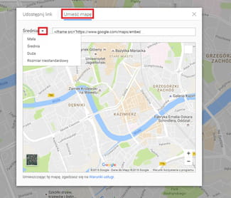 Umieść mapę. Wybierz rozmiar mapy, a następnie skopiuj kod HTML i wklej go w kod źródłowy swojej strony: